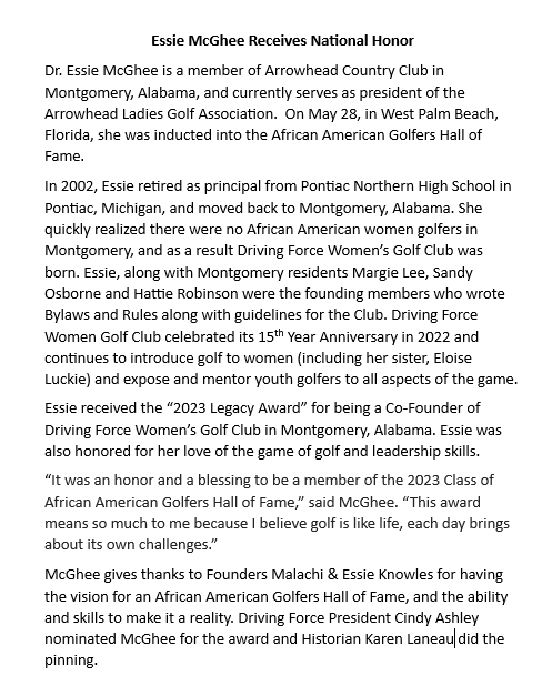 Essie has just been inducted into the African American Golfers Hall of Fame!